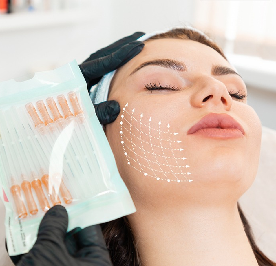 Thread lifts use dissolvable polydioxanone (PDO) threads to lift and tighten the skin. They also aid in the production of your body’s natural collagen. Unlike surgical lifts, PDO threads are noninvasive with no downtime. Thread lifts can be performed on several areas such as cheeks, jawline, brows, temples, and the neck. They may even be used for different areas of the body. PDO threads typically last 12 months but may last as long as 36 months in some cases. Results will vary depending on the individual.